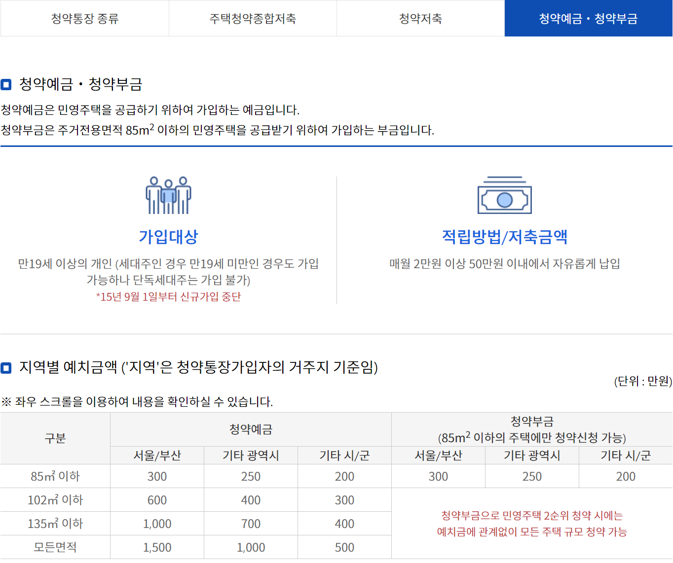 이 페이지에서는 청약 통장을 종류별로 설명해두었는데, 여기서도 청약예금과 부금은 한 항목으로 묶어서 설명하고 있었다. 이 페이지를 보고 청약예금으로 변경할 때 모든 면적을 청약할 수 있게 기존에 300만 원을 넣어두었으니 1,200만 원을 더 준비해서 은행에 가자고 미리 계획할 수 있었다.